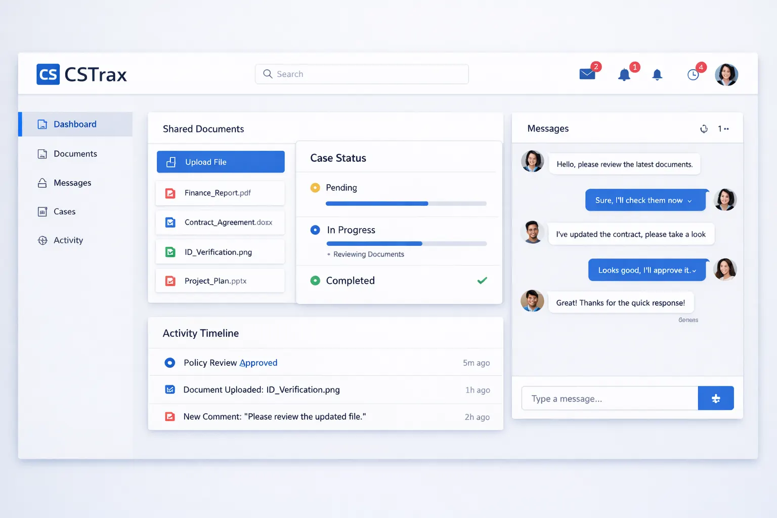 Traditional communication through emails and calls often leads to delays, confusion, and lack of visibility. CSTrax's Client Collaboration Portal centralizes all client interactions in one secure space. Clients can track case progress, upload documents, and stay updated — reducing back-and-forth communication and improving overall efficiency.