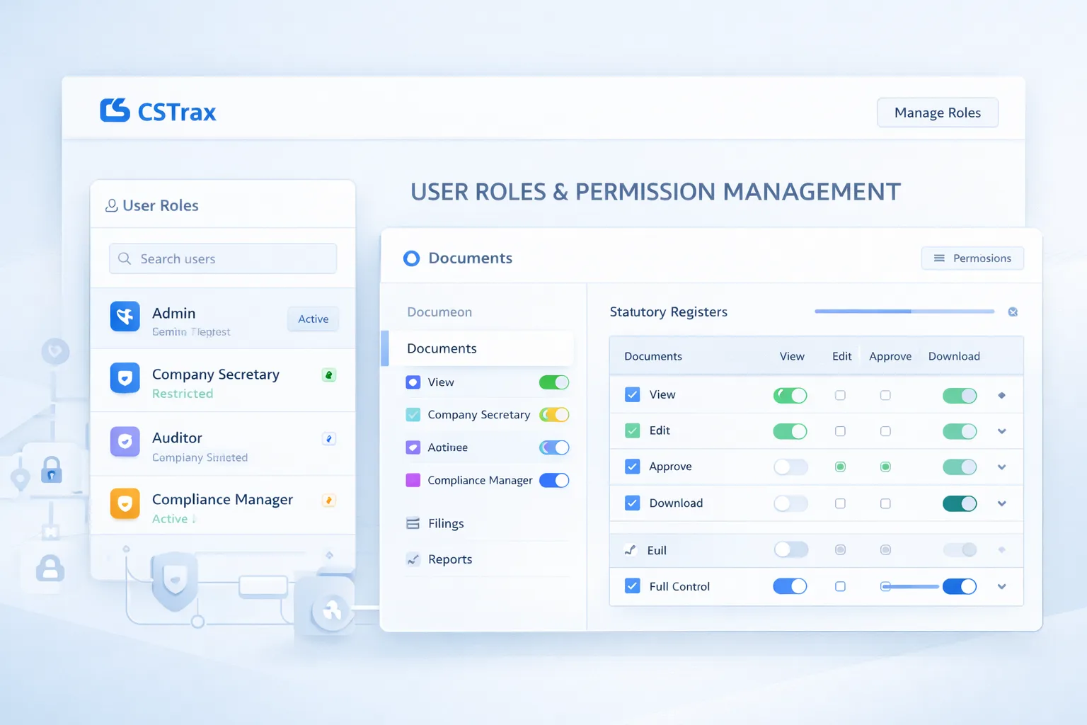 CSTrax provides a robust Role-Based Access Control (RBAC) system that allows Company Secretary firms to manage user permissions with precision. Protect sensitive compliance data, restrict unauthorized access, and maintain complete control over who can view, edit, or manage information within the platform.