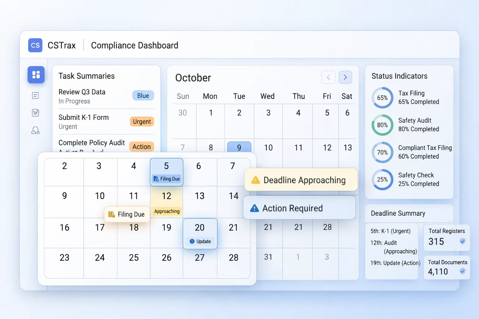 CSTrax simplifies deadline management by providing automated alerts, real-time notifications, and a centralized compliance calendar. The platform ensures that teams remain informed about upcoming filings, due dates, and regulatory tasks well in advance.