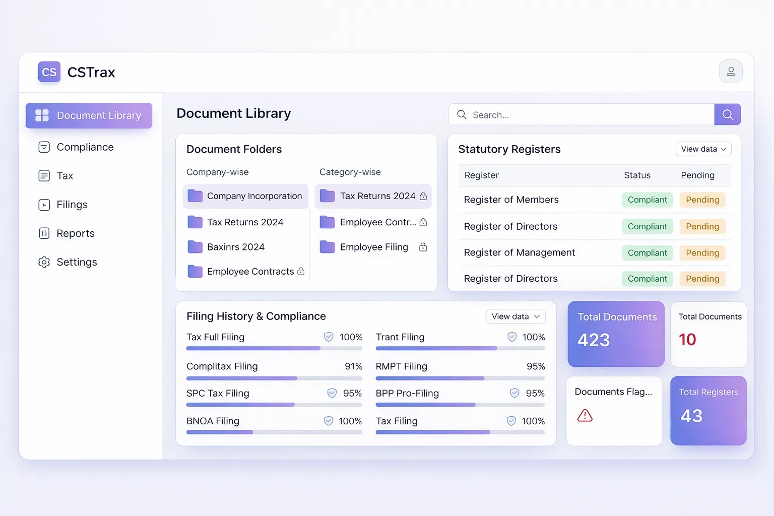 CSTrax enables Company Secretary firms to maintain organised statutory registers, secure compliance documentation, and streamline document management across multiple client engagements.