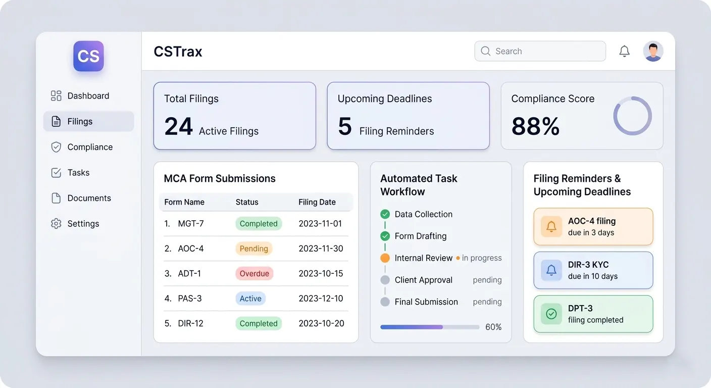 CSTrax provides an automated filing management system designed specifically for Company Secretary firms. The platform organizes MCA compliance tasks, tracks filing deadlines, and enables structured submission workflows for regulatory forms. By centralizing filing activities within a digital platform, CSTrax helps CS professionals maintain accurate compliance records while reducing manual administrative work.