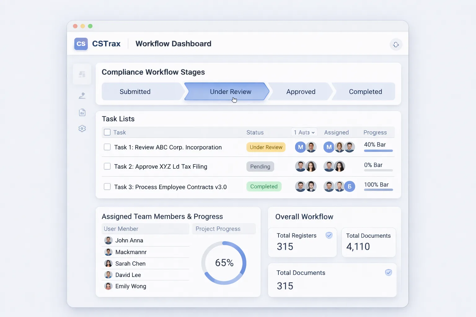 CSTrax enables Company Secretary firms to automate compliance workflows, assign responsibilities, and monitor regulatory activities through a structured digital platform.
