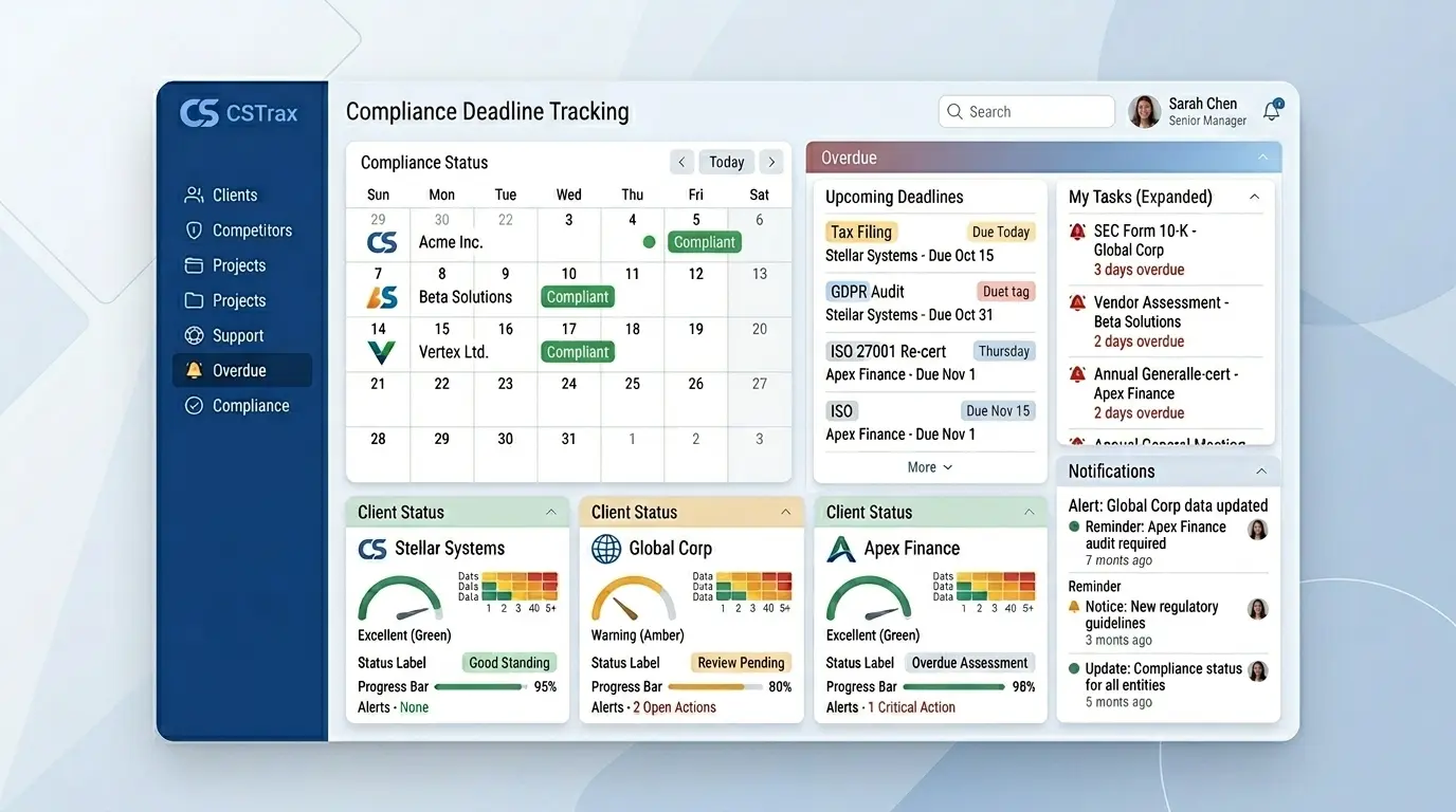 CSTrax introduces a proactive approach to deadline management by continuously tracking compliance schedules and highlighting critical timelines.